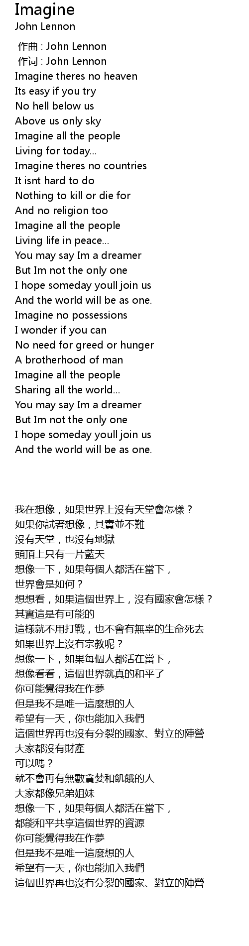 | [00:13.350] | 我在想像,如果世界上沒有天堂會怎樣? |