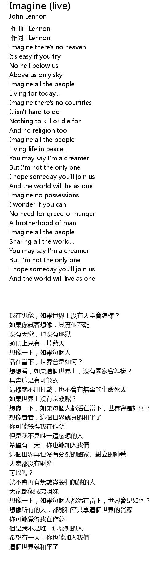 | [00:14.307] | 我在想像,如果世界上沒有天堂會怎樣? |