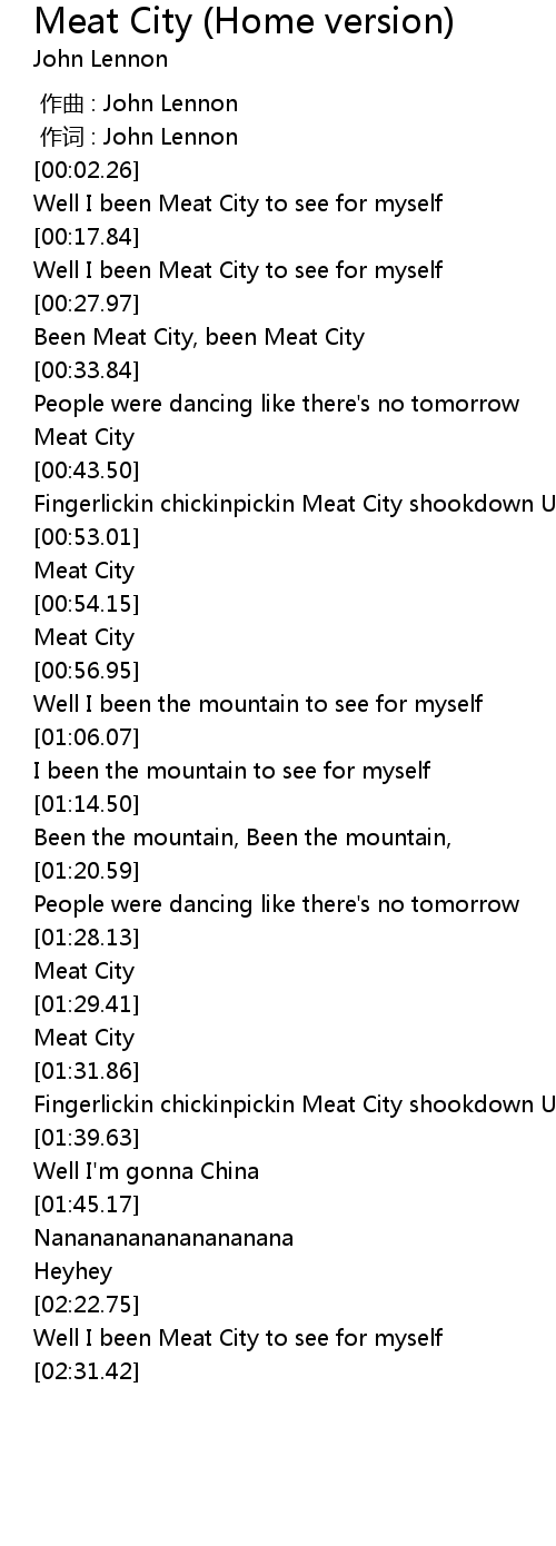 | [01:33.76] | Fingerlickin chickinpickin Meat City shookdown U.S.A. |