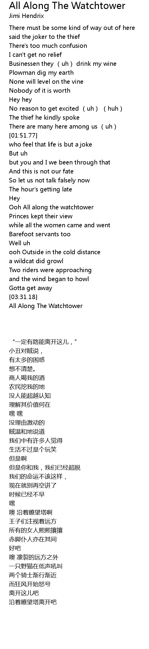 | [03:03.97] | Ooh All along the watchtower |