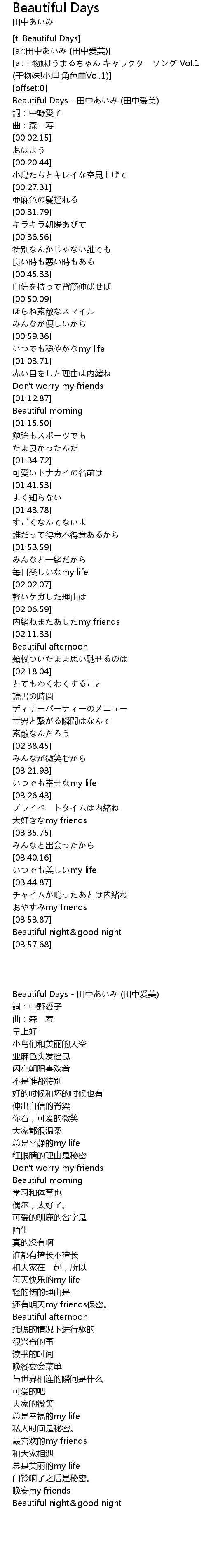 | [00:00.24] | Beautiful Days - 田中あいみ (田中爱美) |