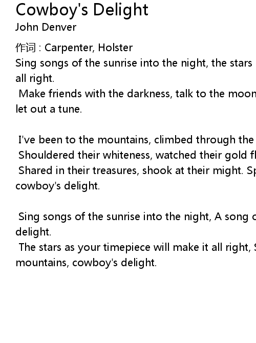 | Sing songs of the sunrise into the night, A song of the mountain, cowboy's delight. | |