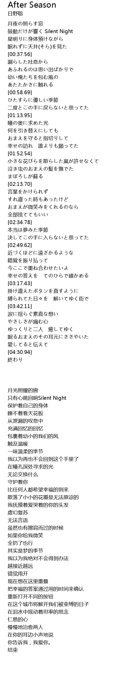 | [00:21.34] | 鼓動だけが響く Silent Night |