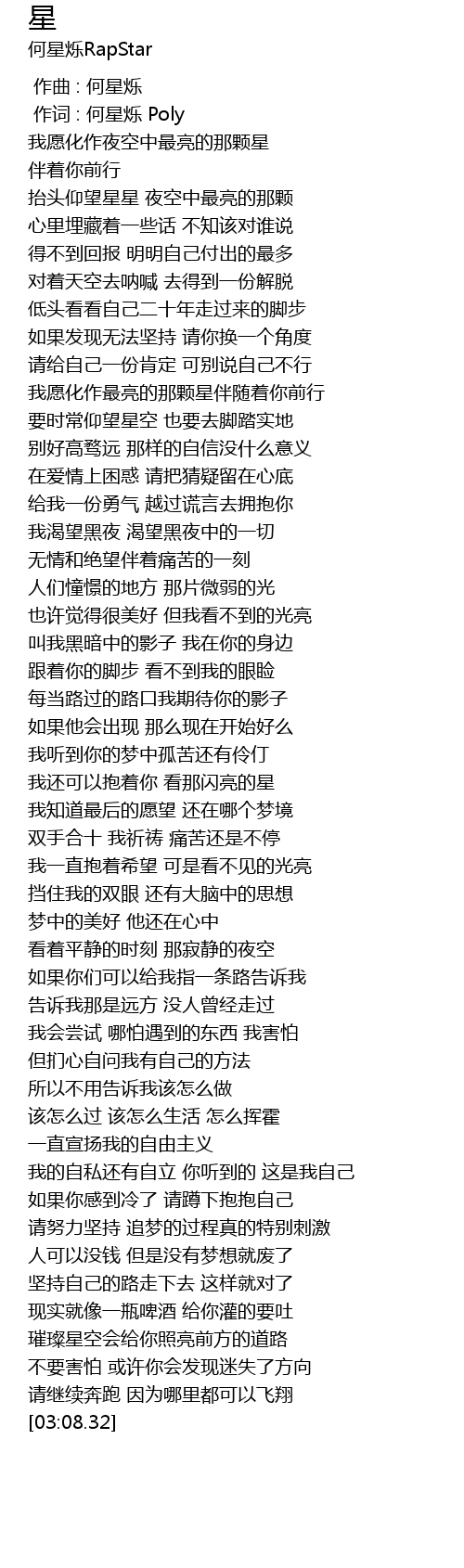 | [00:01.00] | 作词 : 何星烁 Poly |