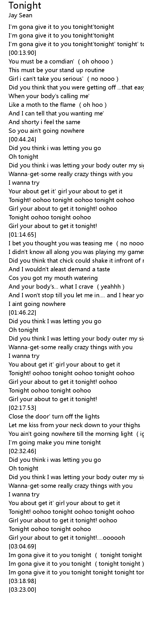 | [00:07.77] | I'm gona give it to you tonight'tonight' tonight' tonight yeah |