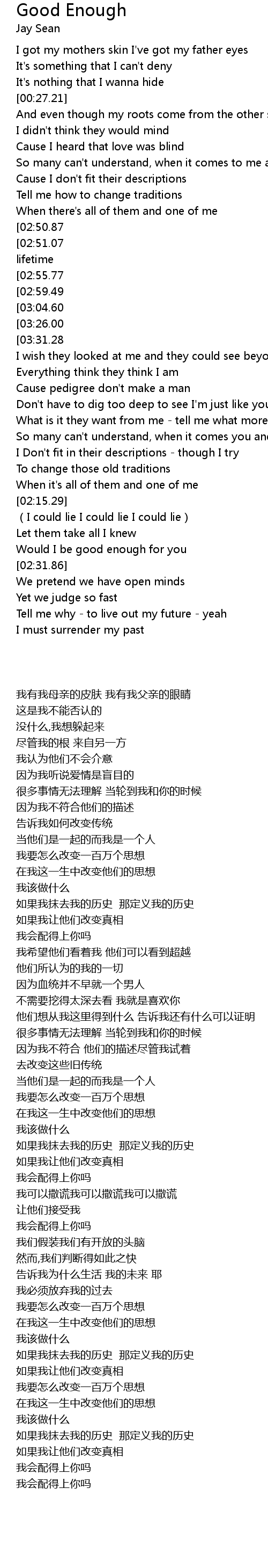| [03:34.78][03:26.00][02:12.86][01:10.32] | Would I be Good Enough For You? |