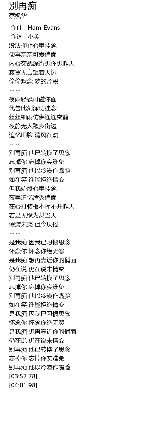 | [02:58.25] | 别再痴 他以冷漠作嘴脸 |