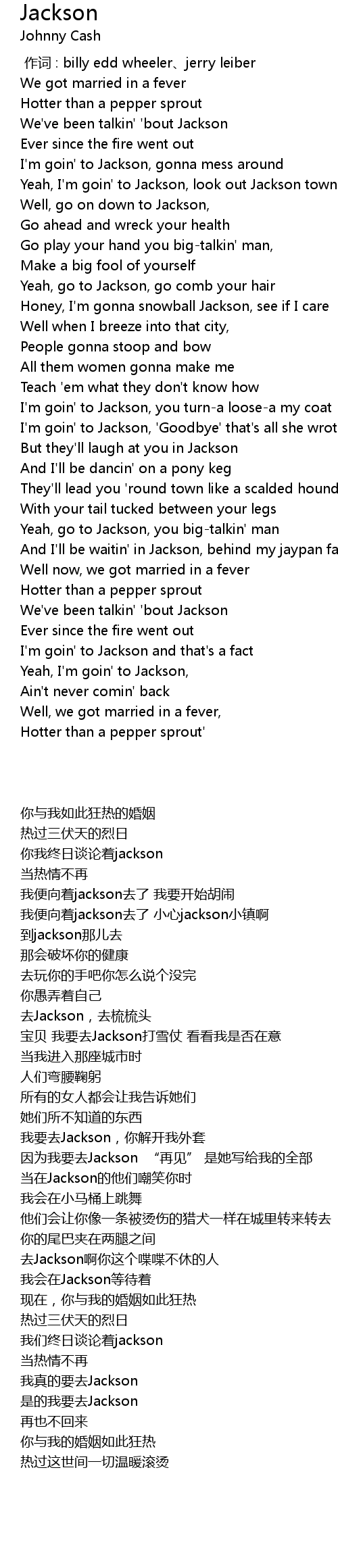 | [00:41.47] | Yeah, I'm goin' to Jackson, look out Jackson town |