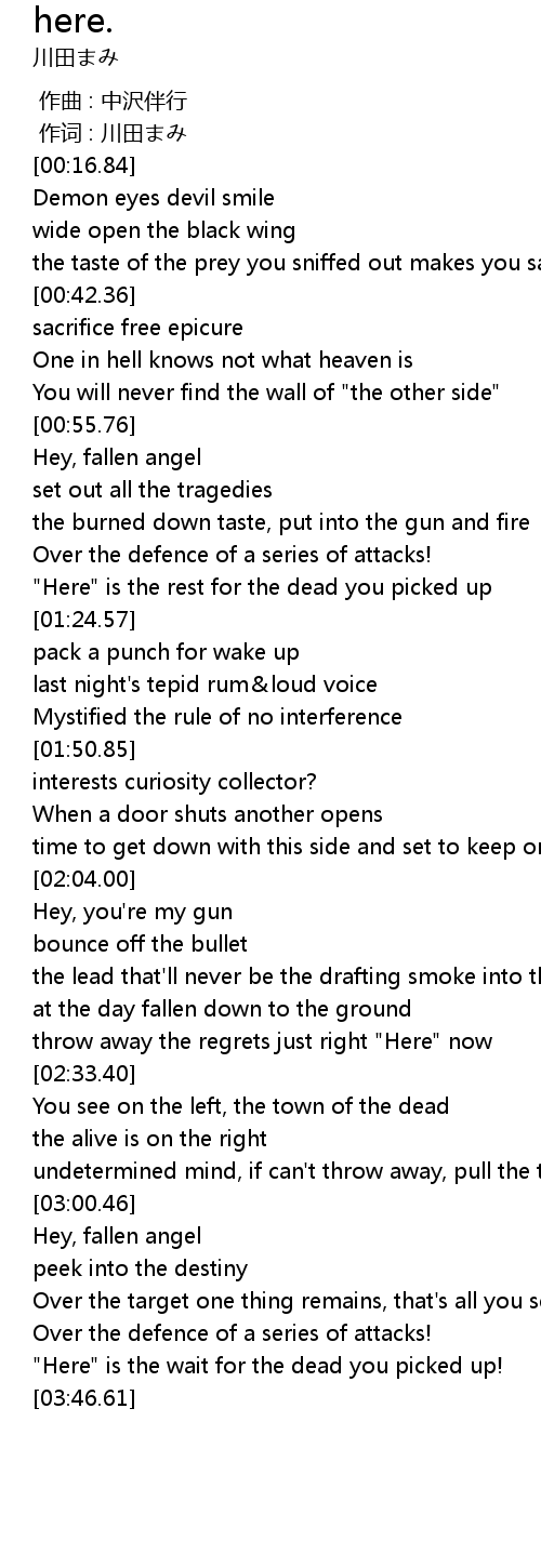 | [01:17.02] | "Here" is the rest for the dead you picked up |