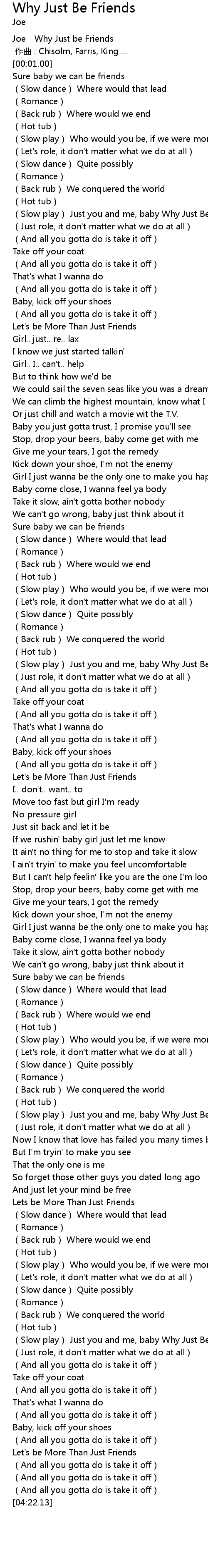 | [00:18.80] | Slow play Just you and me, baby Why Just Be Friends |