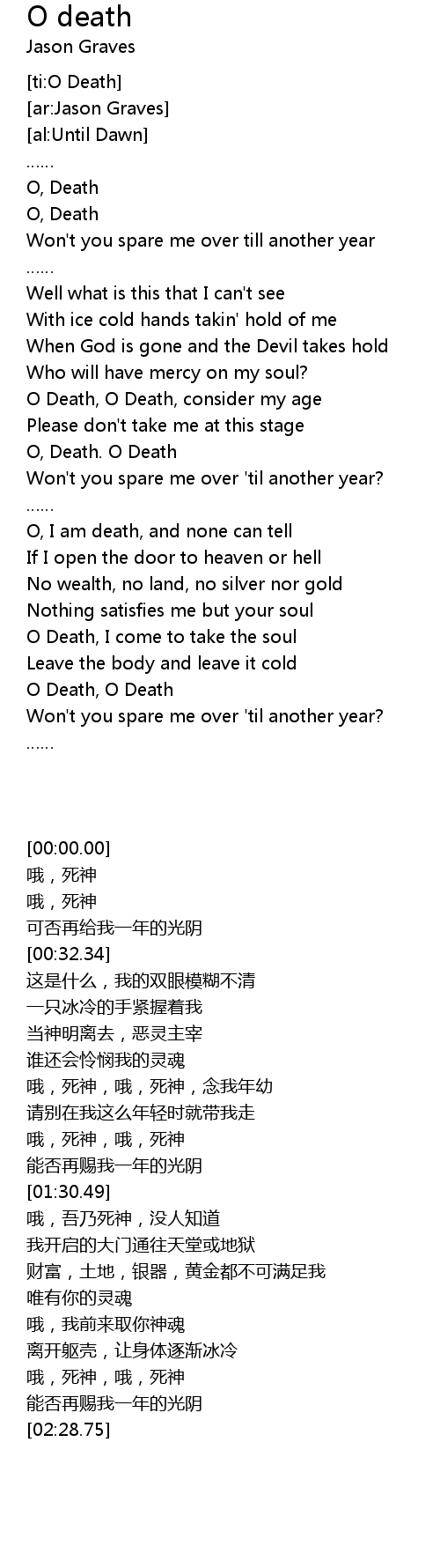 | [01:07.88] | 哦,死神,哦,死神,念我年幼 |