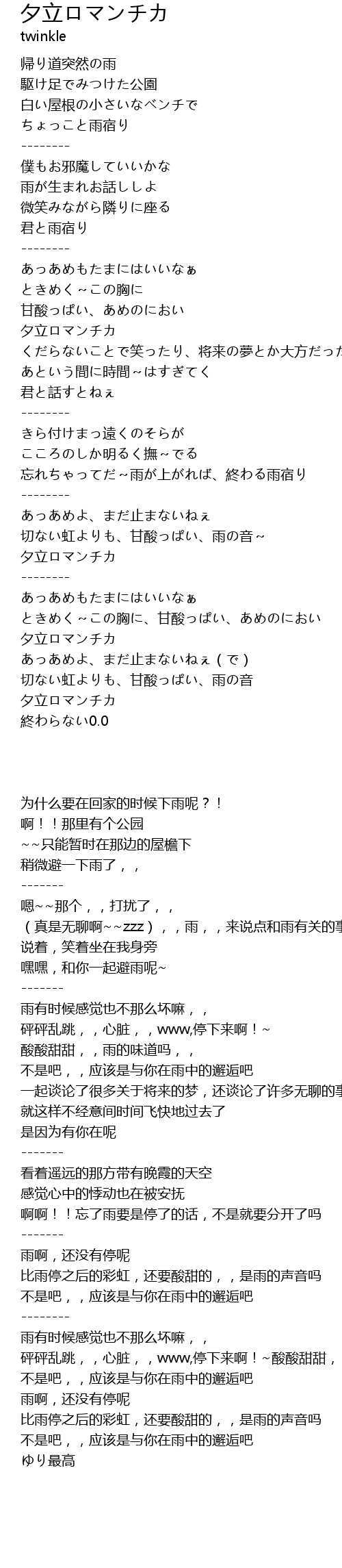 | [00:39.500] | 嘿嘿,和你一起避雨呢~ |