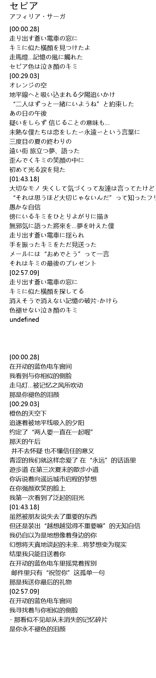 | [00:21.28] | セピア色は泣き顏のキミ |