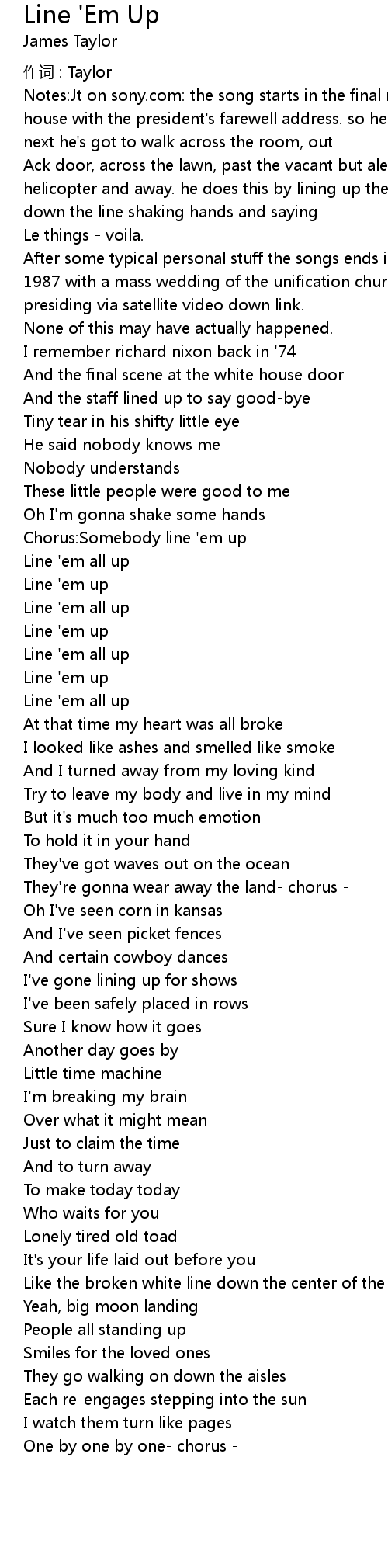 | Notes: Jt on sony. com: the song starts in the final moments of the nixon white house with the president' s farewell address. so he says goodbye . . . goodbye. next he' s got to walk across the room, out | |