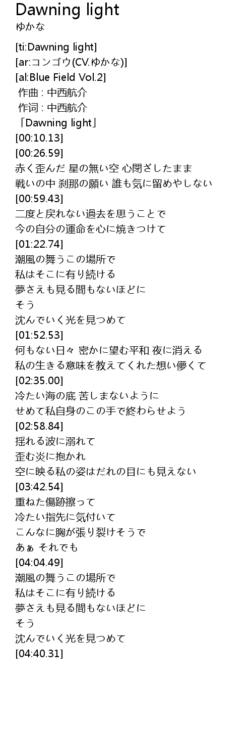 | [02:14.38] | 何もない日々 密かに望む平和 夜に消える |