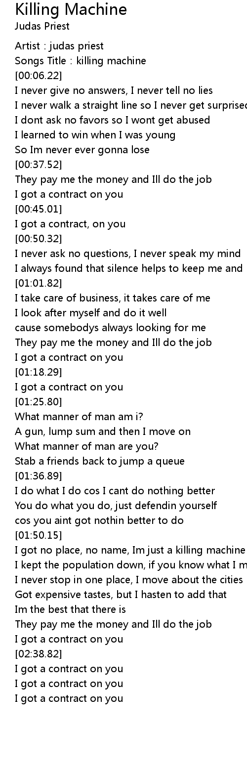| [02:13.25] | I got no place, no name, Im just a killing machine |