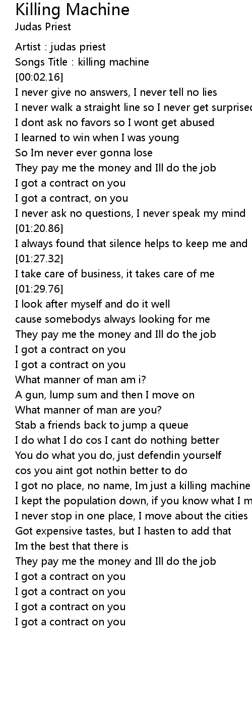 | [02:04.15] | I got no place, no name, Im just a killing machine |