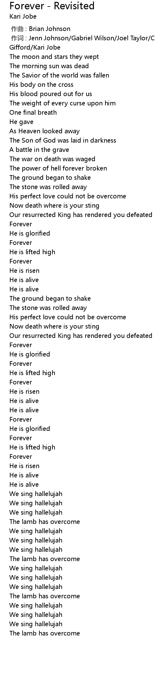 | [00:01.00] | 作词 : Jenn Johnson/Gabriel Wilson/Joel Taylor/Christa Black Gifford/Kari Jobe |