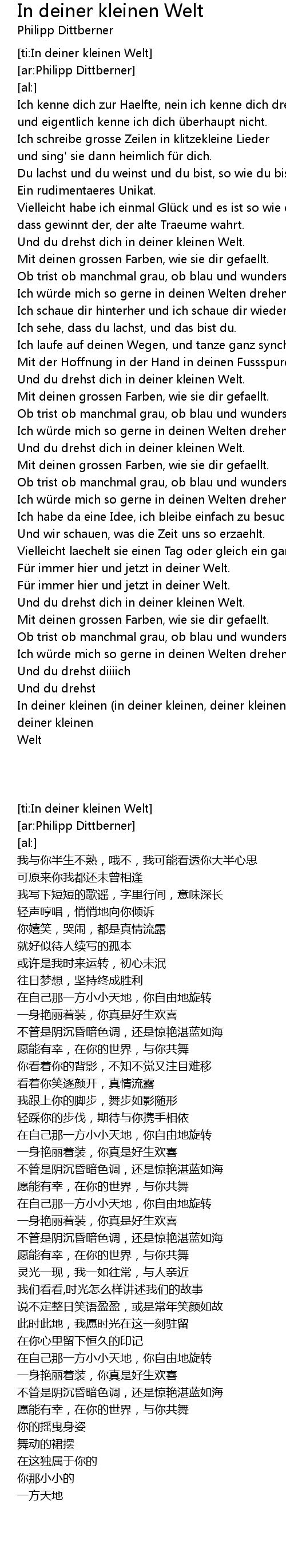 | [01:38.99] | Und du drehst dich in deiner kleinen Welt. |
