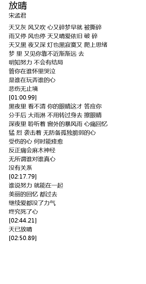 | [01:35.24] | 分手后 大雨淋 不用转过身去 擦眼睛 |