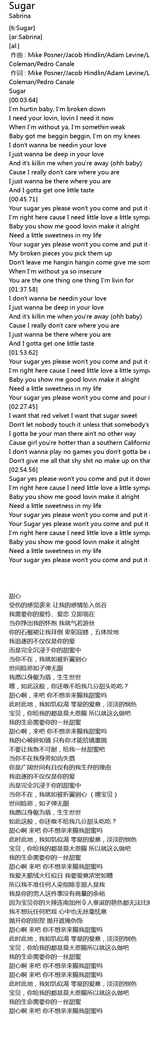| [02:56.17] | Sugar yes please won' t you come and put it down on me |