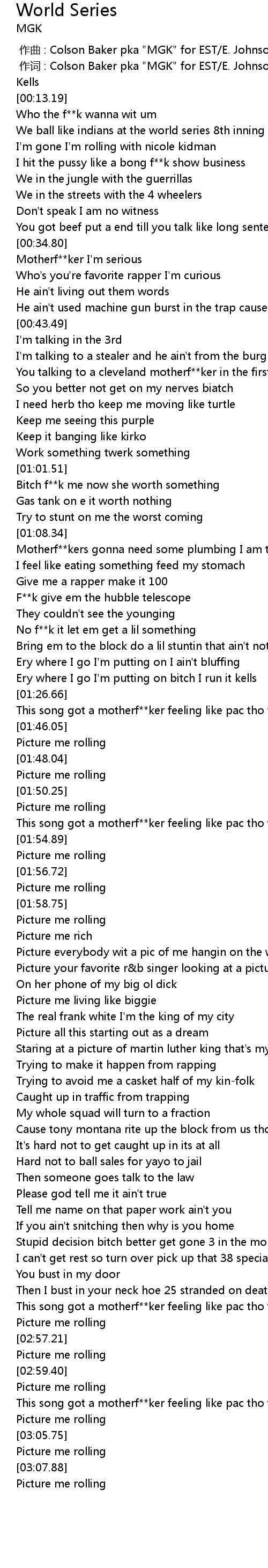 | [00:00.00] | 作曲 : Colson Baker pka "MGK" for EST/E. Johnson/B. Allen |