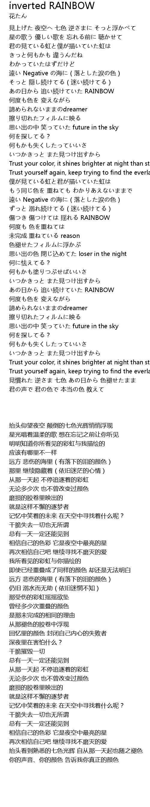 | [00:00.00] | 抬头仰望夜空 颠倒的七色光辉悄悄浮现 |