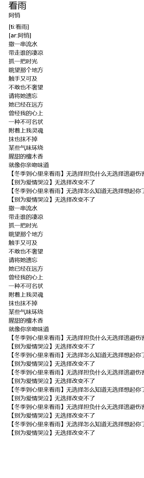 | [02:32.731] | 【冬季到心里来看雨】无选择怎么知道无选择想起你了 |