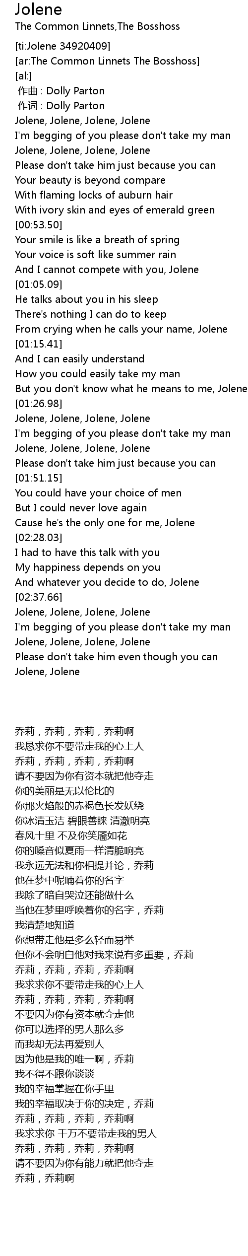 | [02:39.33] | Jolene, Jolene, Jolene, Jolene |