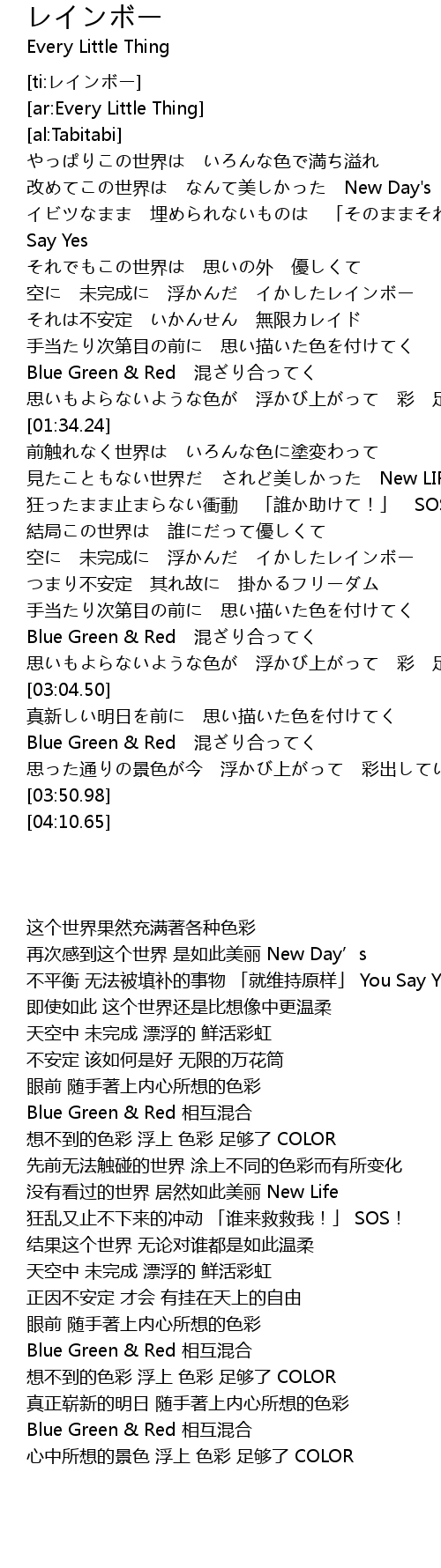 | [00:46.35] | 天空中 未完成 漂浮的 鲜活彩虹 |