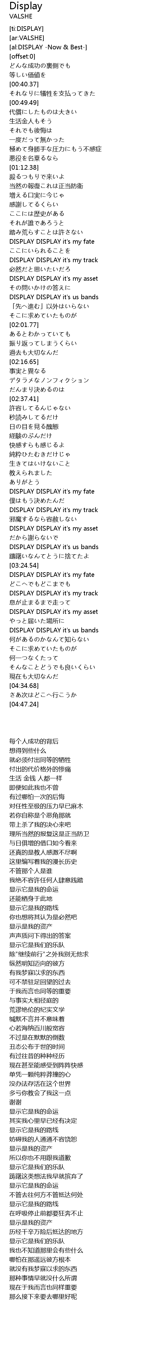| [01:40.19] | DISPLAY DISPLAY it' s my fate |