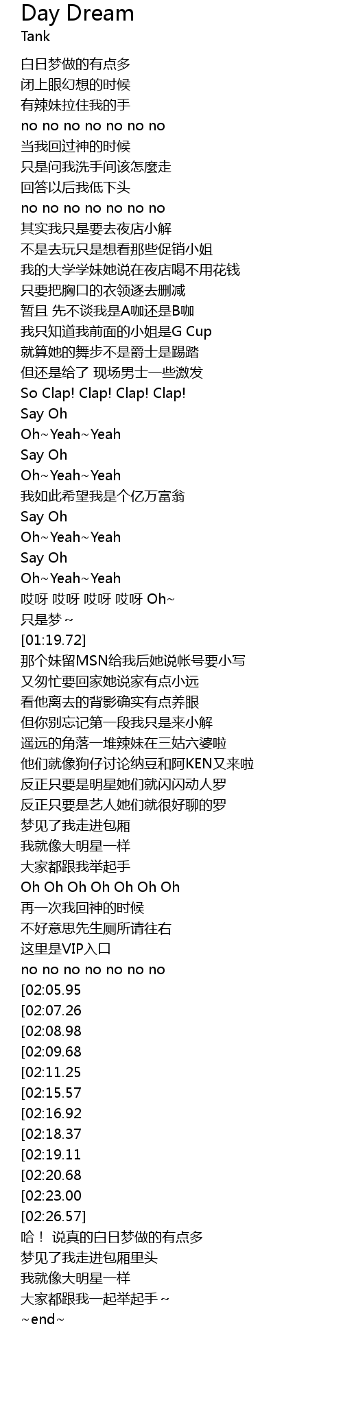 | [02:34.56] | hā! shuō zhēn de bái rì mèng zuò de yǒu diǎn duō |