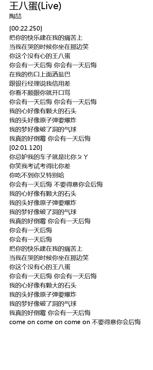 | [02:30.000] | 你会有一天后悔 不要得意你会后悔 |