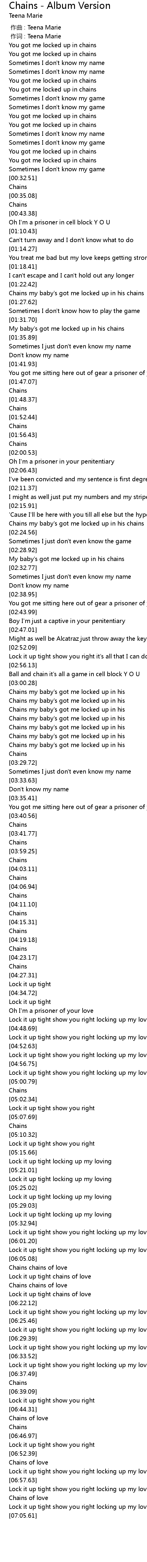 | [02:20.27] | Chains my baby's got me locked up in his chains |