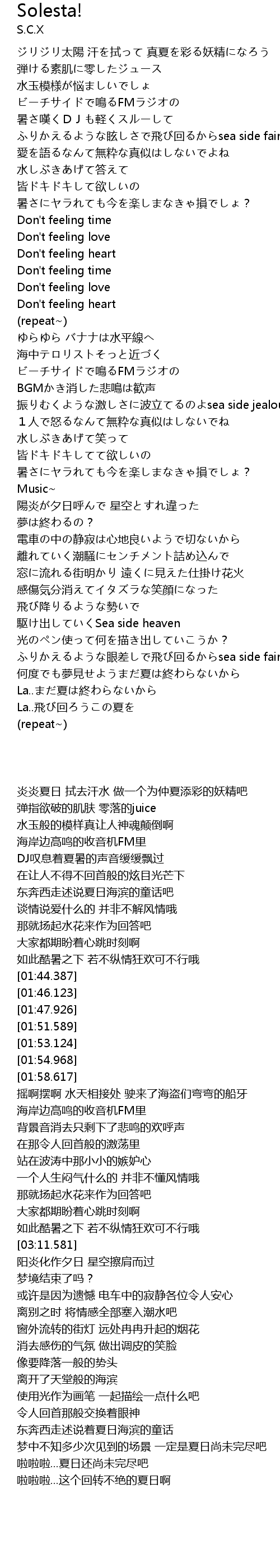 | [02:26.962] | ビーチサイドで鳴るFMラジオの BGMかき消した悲鳴は歓声 |