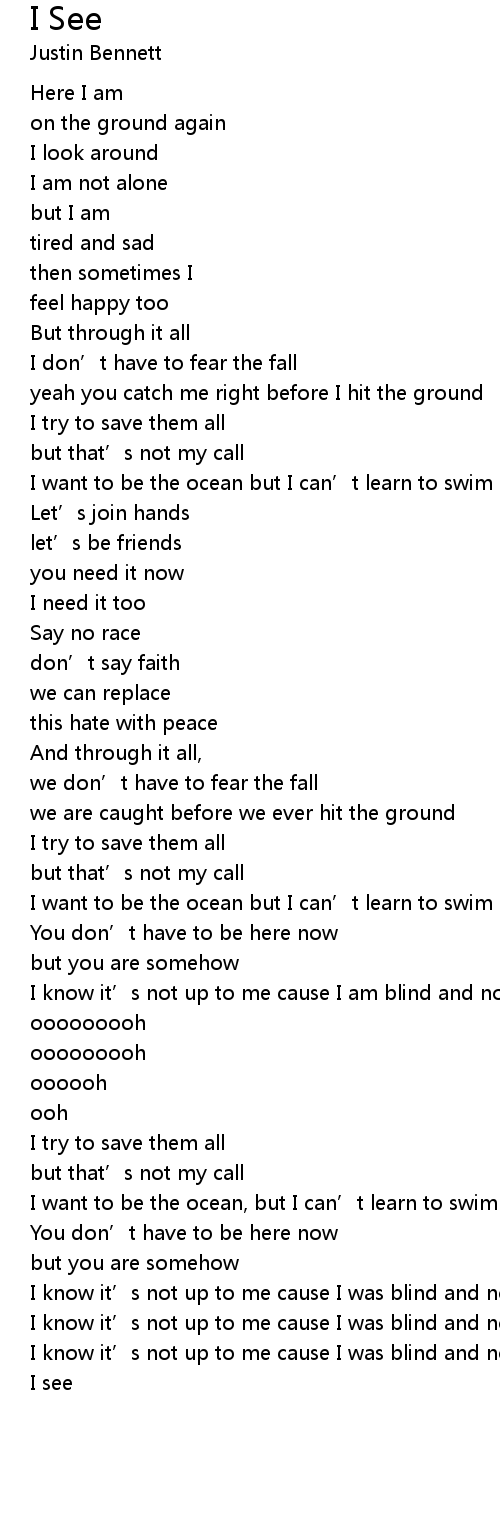 | [03:41.500] | I know it' s not up to me cause I was blind and now I see |