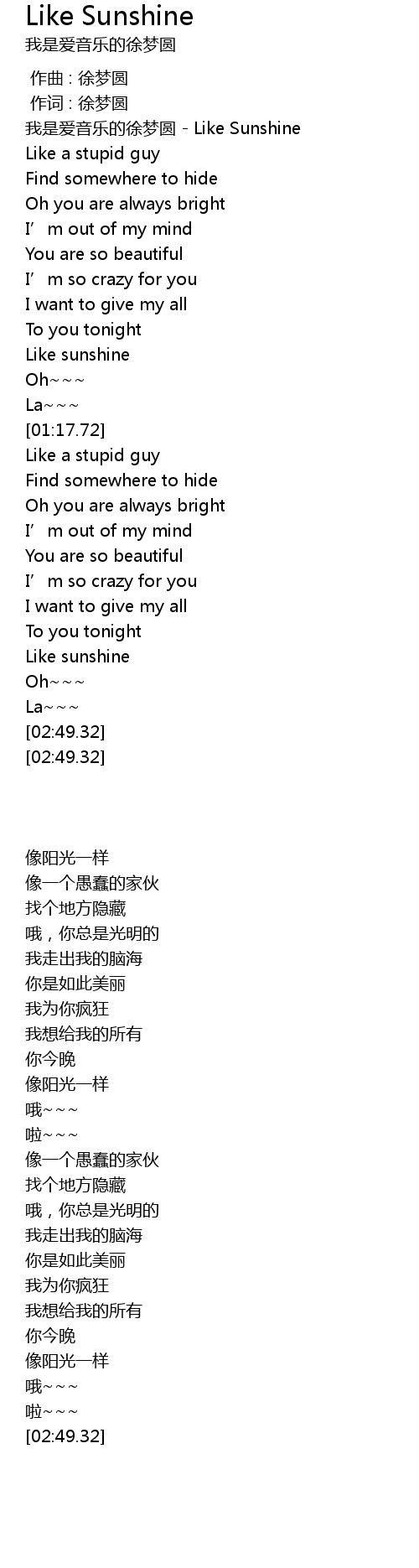| [00:00.10] | 我是爱音乐的徐梦圆 - Like Sunshine |