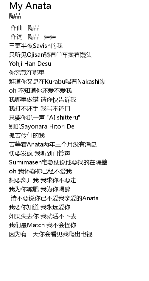 | [02:23.130] | 请不要说你已不爱我亲爱的Anata |