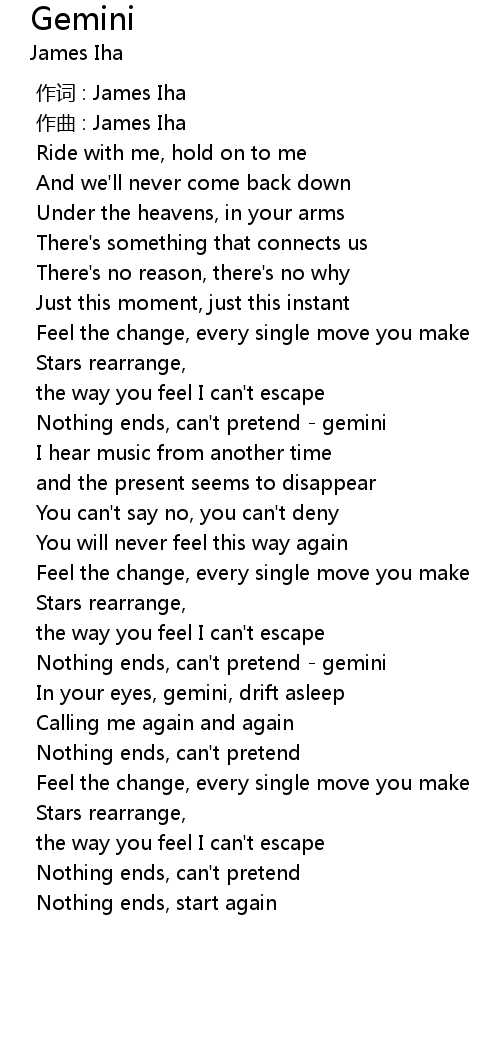 | [02:12.090] | Nothing ends, can' t pretend gemini |