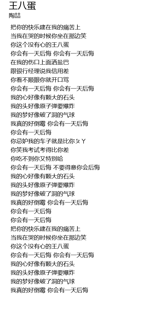 | [02:00.000] | 你会有一天后悔 不要得意你会后悔 |