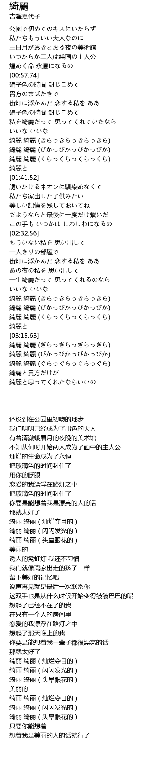 | [03:01.75] | 綺麗 綺麗 (きらっきらっきらっきら) |