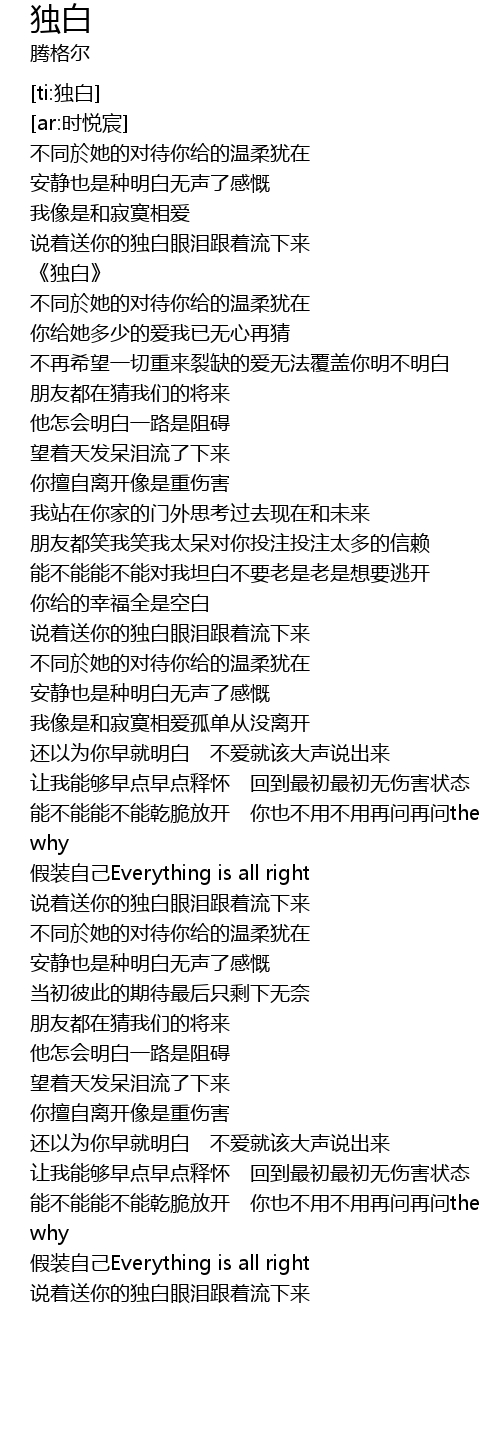 | [03:21.137] | 说着送你的独白眼泪跟着流下来 |