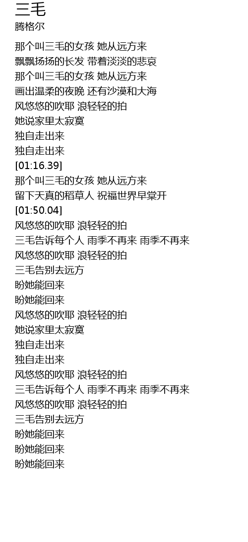 | [00:34.60] | 那个叫三毛的女孩 她从远方来 |