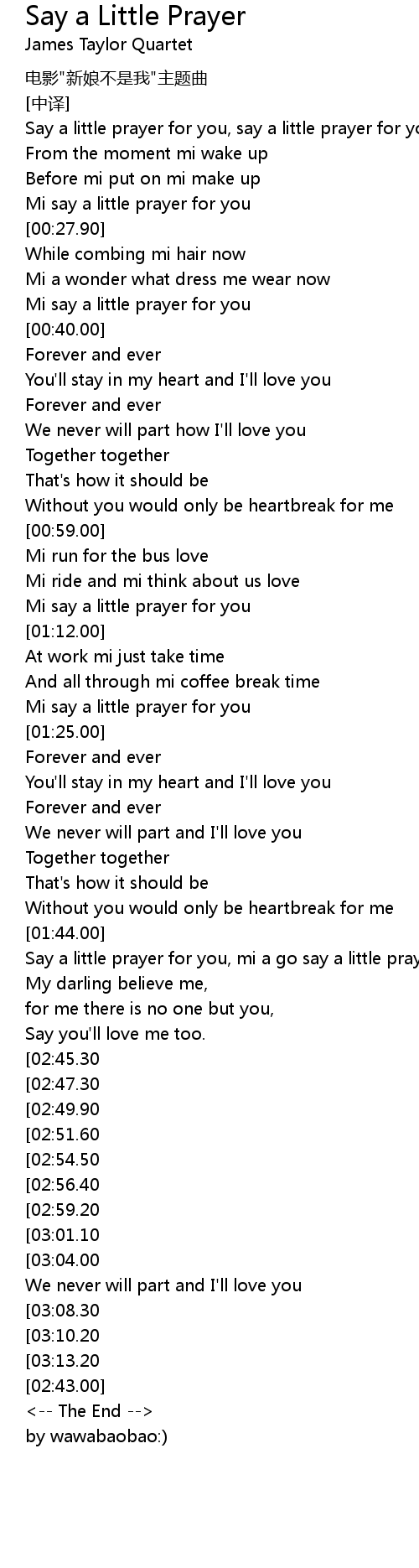 | [00:36.80] | Mi say a little prayer for you |