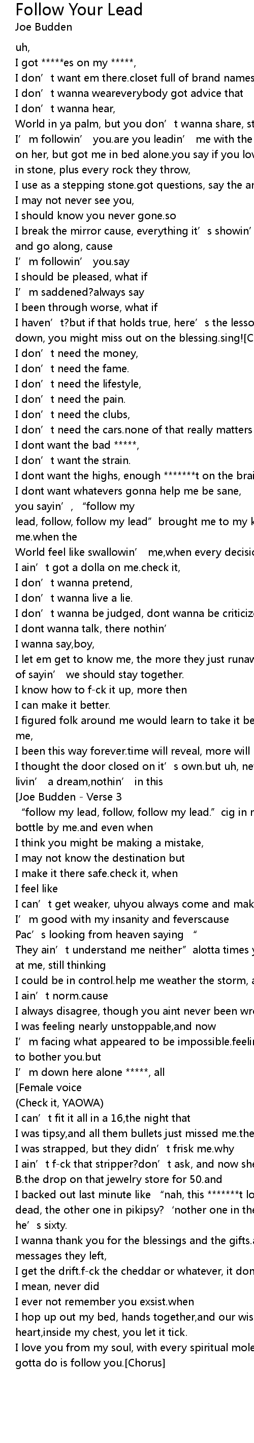 | World powerful enough to pause it. sing! Chorus Joe Budden Verse 3 sayin' " follow my lead, follow, follow my lead." cig in my mouth, perscription bottle by me. and even when | |