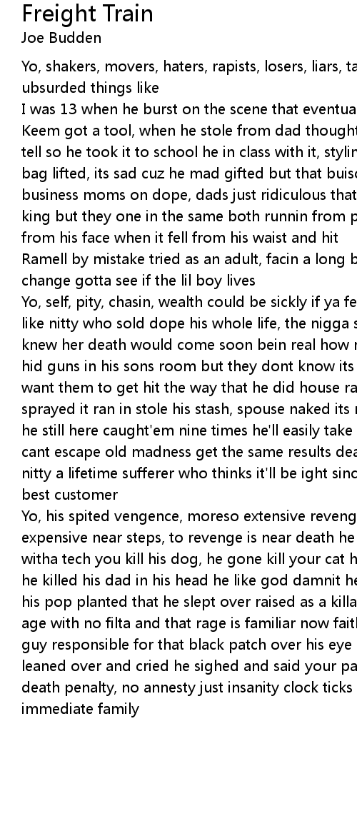 Yo, his spited vengence, moreso extensive revenge is best served cold but its expensive near steps, to revenge is near death he disappears stressed reappears witha tech you kill his dog, he gone kill your cat hispops killed his mother so he killed his dad in his head he like god damnit he crept over with the same gun his pop planted that he slept over raised as a killa from an age thats a thrilla age with no filta and that rage is familiar now faith has him sleepin over that guy responsible for that black patch over his eye pillow over al's face he leaned over and cried he sighed and said your parents wont know that you died death penalty, no annesty just insanity clock ticks on the last member of his immediate family