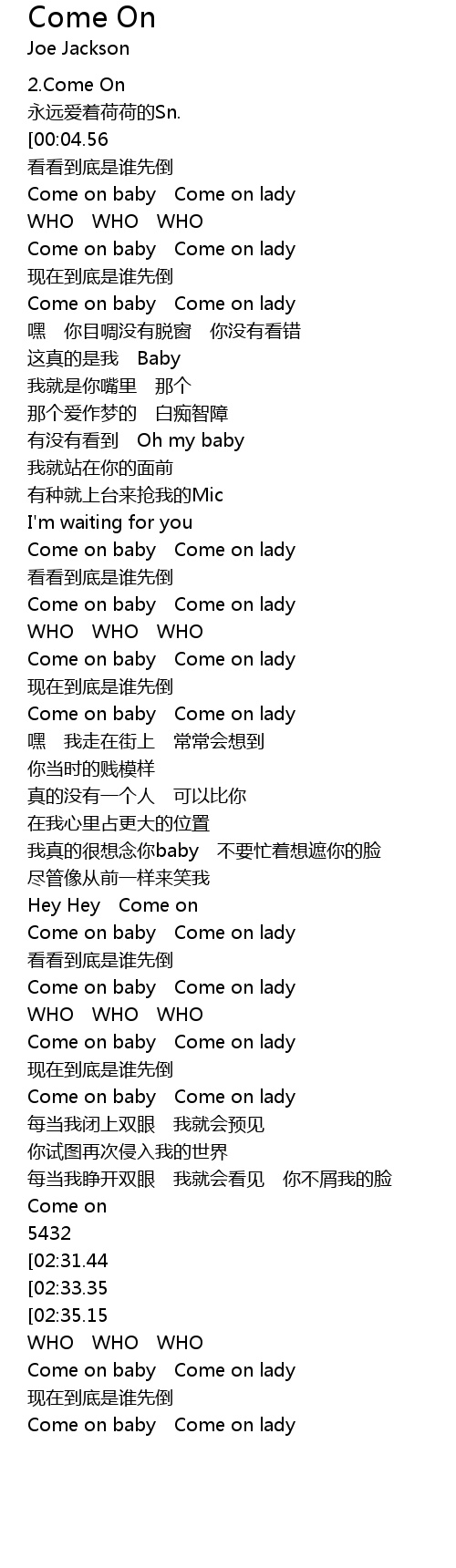 | [02:43.63][02:35.15][02:18.14] | Come on baby Come on lady |