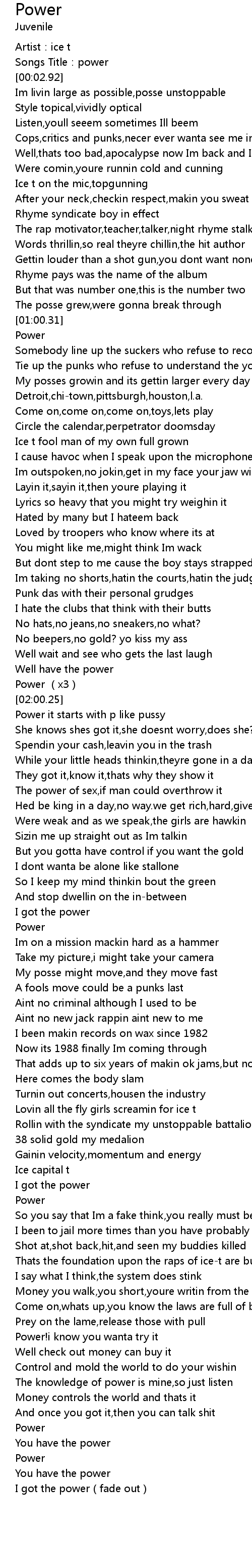 | [00:00.94] | Artist: ice t |