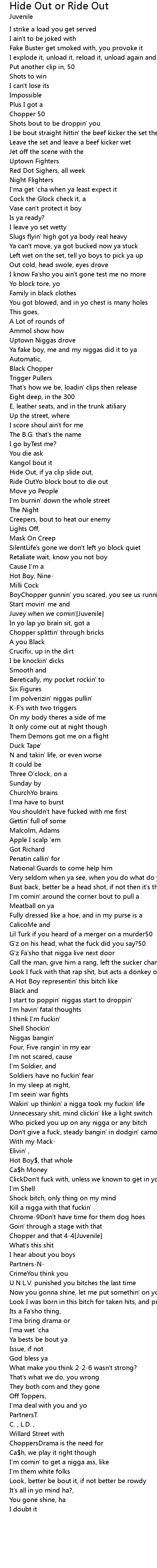 Don't give a fuck, steady bangin' in dodgin' camoflaguin' |