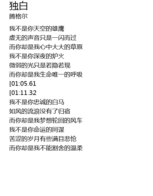 | [00:32.10] | ér nǐ què shì wǒ xīn zhōng dà dà de cǎo yuán |